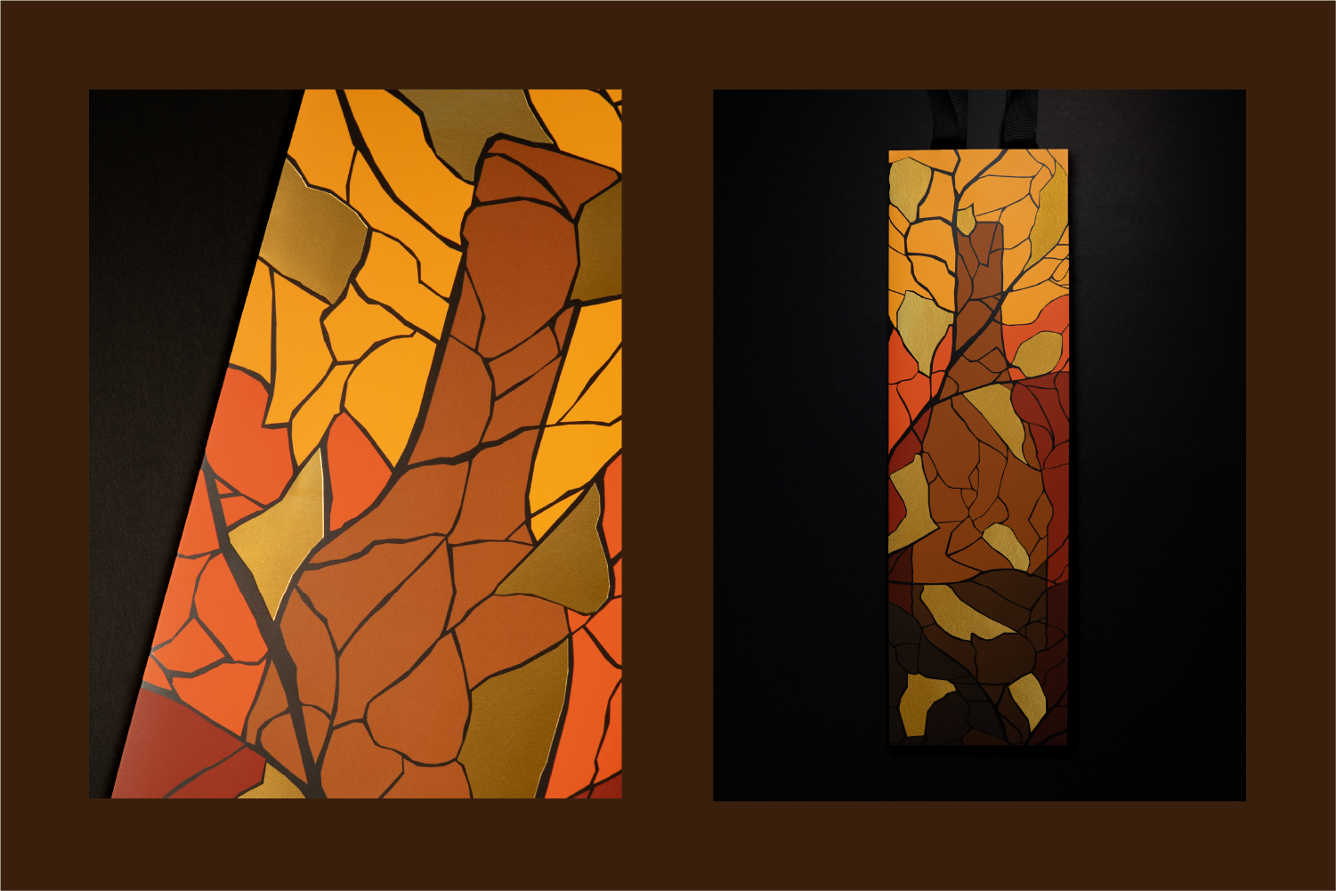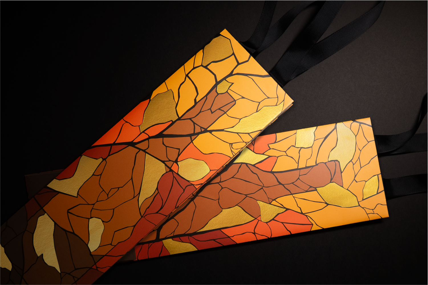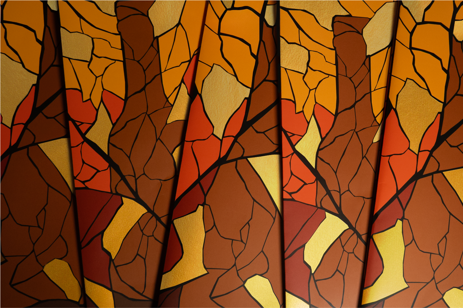 Glass and stained glass elements along with gold foil accents capture the beauty of fall by mimicking the veins and colour gradients of autumn leaves. The stained glass effect reflects glass bottles and drink glassware while also symbolizing sustainability, transforming fragments into beauty.