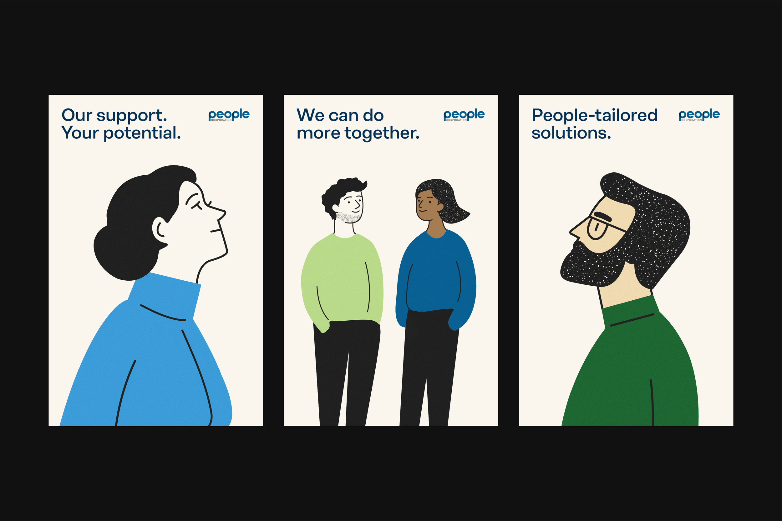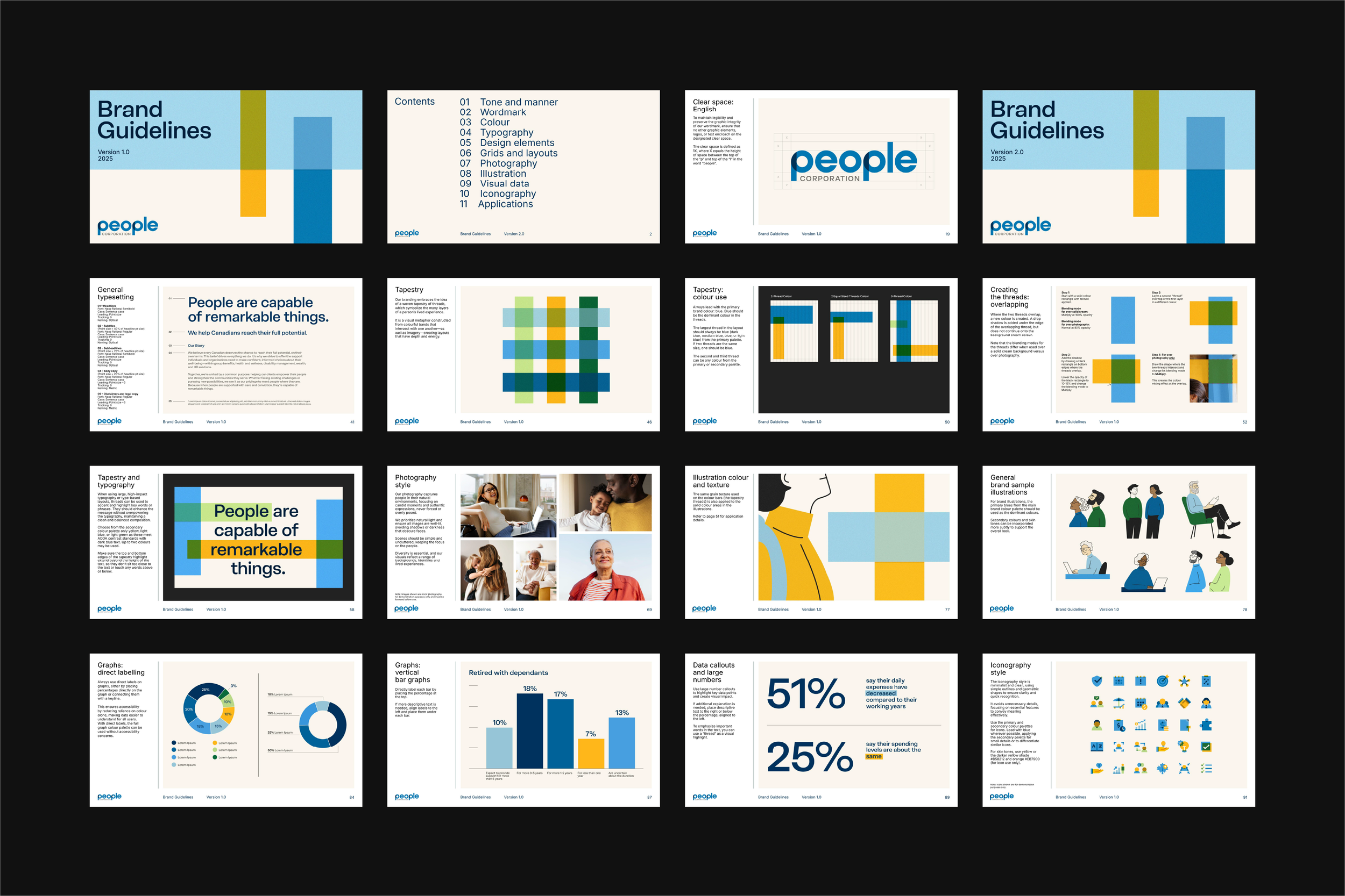 The People Corporation brand identity was designed to stand apart from other insurance brokerages and to clearly express its purpose of empowering people to reach their full potential. Inspired by the idea of a woven tapestry, the visual system represents the many layers of human experience through intersecting bands of colour and imagery that create depth, energy, and connection. This concept continues in the custom wordmark, where overlapping, transparent letterforms within the “p”s reflect the theme of interconnected threads and the strength that comes from people coming together.